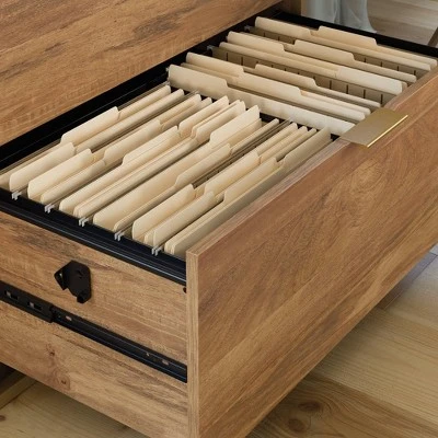 File in style. Create versatile storage options in your home without having to sacrifice the beautiful design you love with this lateral file cabinet from the International Lux collection. This 2 drawer lateral file cabinet features two large drawers with full extension slides that accommodate legal or letter-size hanging files so you can keep all your important documents organized. The interlocking safety mechanism on this modern file cabinet allows only one drawer to open at a time for added safety. It also features an open storage shelf above the top drawer for easy access storage of items like folders and books. Its spacious top surface makes a great place for additional storage and display of items like an accent lamp, your printer, and photos of your family. This metal frame file cabinet is finished on all sides for versatile placement in your home office or other rooms throughout your home. Finished in Sindoori Mango® and detailed with a metal frame in Satin Gold finish and stylish hardware, this charming contemporary 2 drawer file cabinet turns something boring into something tasteful.