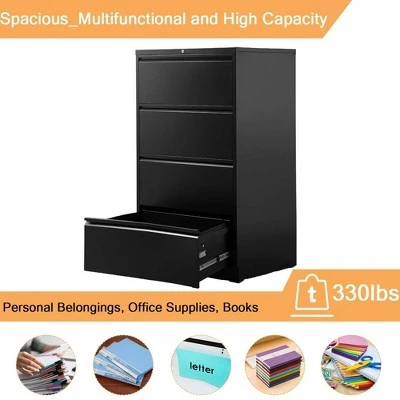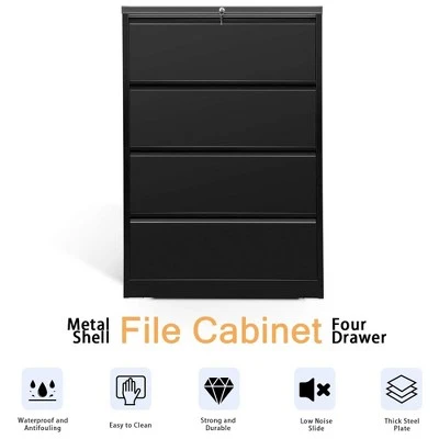 Organize and protect important documents, work files, and more with the 4 Drawer Lateral File Cabinet from AOBABO. This spacious file cabinet is the perfect way to declutter your office space while keeping all of your important documents in 1 place.Designed with full extension and steel ball-bearing suspension, the drawers can be opened and closed quietly and easily. When a single drawer is open, the interlocking system prevents the other drawers from opening, which prevents tipping and harmful accidents. The file cabinet is made of heavy-duty steel, and the surface is powder-coated, making it smooth and resistant to rust.This lateral file cabinet comes with 1 lock that can simultaneously secure all 4 drawers, ensuring the safety of your belongings and privacy at any time. The plastic pad on the bottom of the cabinet protects your floors from scuffs while also reducing noise. Equipped with 4 spacious and deep hanging file drawers, each drawer has 1 adjustable hanging bar, allowing you to organize your paperwork to your specific liking.Get sleek style, functionality, and convenient safety all-in-1 with the AOBABO 4 Drawer Lateral File Cabinet.