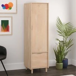 This storage cabinet with file drawer from the Clifford Place collection adds mid-century design to any room you need more storage. This storage cabinet with door offers versatile storage options for all your around home essentials. Behind the door is a hidden storage space with an adjustable shelf and a hanging hook. Versatile storage file cabinets like this offer a place to hang your coat and purse as you walk through the door, to store your collection of novels and notebooks, or even to stash away blankets and board games. The options are endless! A lower drawer with full extension slides accommodates letter size hanging files for additional organization options. Use this home office storage cabinet anywhere in your home because this piece will look polished from all angles. Finished on all sides in Natural Maple and accented with solid wood feet, this stunning cabinet adds style any place that storage is lacking.