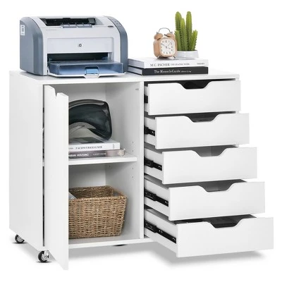 Such a versatile storage dresser will surely improve your life quality! It features a wide cabinet top, single door cabinet and 5 drawers to enlarge storage capacity and classification space for a variety of office supplies and daily items. Besides, 5-position adjustable shelf inside allows you to customize storage space with great convenience. What’s more, thickened board with premium edge-sealing means higher sturdiness, better durability, and longer life span. Equipped with 5 360°swivel casters, 2 of which are lockable, the printer stand can go anywhere you like. Whether used as a storage dresser or file cabinet, it will undoubtedly be a charming complement to your study, living room, and office, etc.