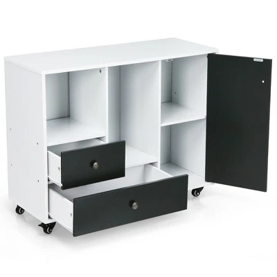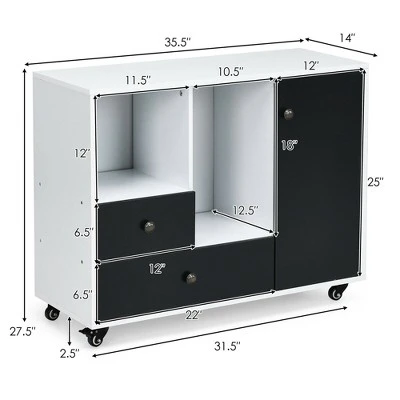 Fill your home with modern appeals with our multi-storage rolling filling cabinet! Considerable storage and display spaces have been offered to you with 2 open shelves, 2 concealed adjustable cubbies, 2 drawers, and a wide cabinet top. 4 steel casters make this lateral filling cabinet more convenient to rearrange locations while adding more stability with braking systems. With a bulky load-bearing of 188 lbs in total, this portable printer stand is suitable as an office filing organizer, a kitchen rolling buffet, a storage sideboard, and so on. In addition, this high-quality cabinet requires manual assembly and minimal maintenance.