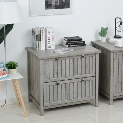 Ready to organize your home office? Pick up the file cabinet, and you’ll be ready in no time. Woodgrain veneer, slat-front detail, and elegant square knobs enhance a rustic style. 2 easy-glide drawers accommodate hanging letters and legal-sized files. A spacious top enhances the storage room. Crafted of P2 MDF and particleboard, this filing cabinet is a durable and attractive addition to the home office and study.