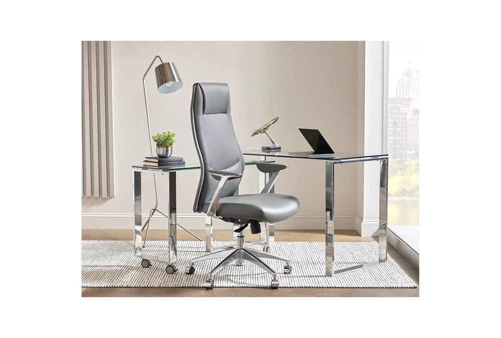This Karlstad Grey Faux Leather High Back Desk Chair is the perfect addition to any contemporary office. With its tall back and ergonomic design, it offers comfort and support for extended periods of sitting. The chair features wheels, arms, gas lift, and swivel capabilities, providing both mobility and convenience.