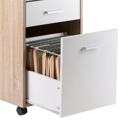 Customize your home office or professional workplace with the Kenner Mobile Storage Cabinets. This 3-drawer File Cabinet is practical and functional on its own or can be combined with the Modular Desk Top along with any of the other Kenner Mobile Cabinets. The File Cabinet is ideal for a home office, artist’s studio, or anywhere you need storage with a bright, contemporary look. Keep legal or letter-sized files in the bottom drawer and smaller office supplies in the top two drawers. The unit moves easily on sturdy casters, two of which lock. And the styling of the Cabinet is as handsome as it is versatile. The frame is made of durable composite wood in a finish that has all the appearance of natural reclaimed wood. The drawer facings are finished in linen white with modern matte-silver plastic drawer pulls.