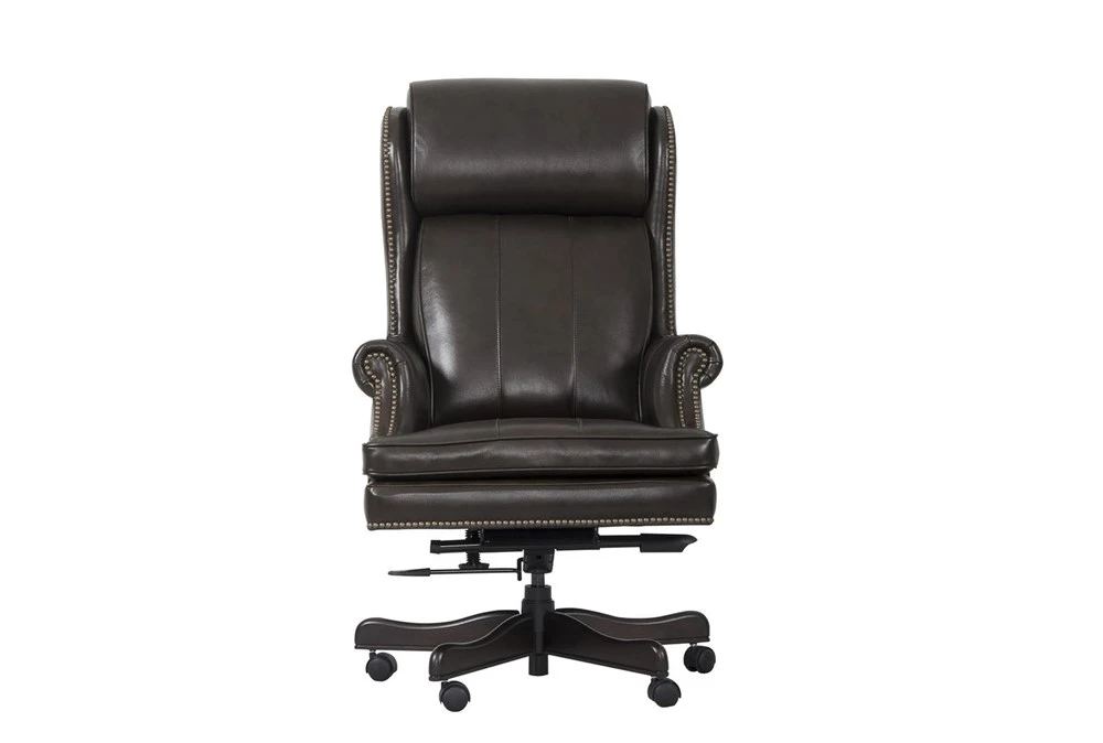 This Lowry Brown Leather Desk Chair is the perfect addition to any traditional office space, featuring nailhead detailing, rolled arms, and a high back with headrests for ultimate comfort. With casters and a gas lift, this chair is also practical and functional, making it a must-have for any professional workspace.