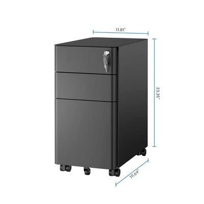 Organize your office supplies and folders in style, with this 3-drawer file cabinet featuring a slim and contemporary design that enhances any office space. With a large storage capacity, the bottom drawer accommodates letter, legal, and A4 size folders, providing you with plenty of room to organize and store your important files. It extends fully allowing you easy access to your folders. The top drawer of the file cabinet includes an adjustable pencil tray, allowing you to keep your writing utensils neatly organized and easily accessible. No more searching for pens or pencils! All drawers open and close smoothly and quietly and the hidden drawer pulls give the cabinet a seamless and clean look. Our file cabinet is designed to save space, making it an ideal choice for both corporate and home office environments. Its compact size allows it to fit seamlessly into any office layout. Crafted from high-quality steel, our file pedestal is built to withstand the demands of daily use. It features a sturdy and durable design and is equipped with 360 swivel wheels for easy mobility and accessibility. Keep your belongings safe and secure thanks to the built-in lock. You can have peace of mind knowing that your confidential documents and valuable items are protected. For added safety and accident prevention, only one drawer can be opened at a time and the additional front wheel prevents the unit from tipping.