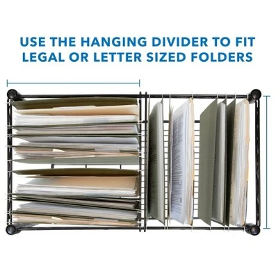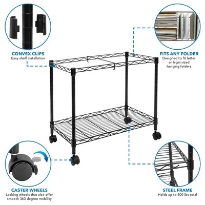 Our mobile file cart is the ideal filing management tool for your office. Hang your file folders to get organized and save space. It features four swiveling wheels to easily move between workspaces, or to slide in and out of your under desk area. It accommodates letter and legal size hanging folders. It’s ideal for personal workspaces, home offices, conference rooms, libraries or anywhere else storage and filing is needed.Lower shelf offers additional storage space for office supplies or other items. Made from high-strength metal wire for durability and high load capacity. Each shelf can carry up to 150 lbs of load. Sleek design and black powder coated finish suits any office space and protects your mobile filing cart from chipping and damage.