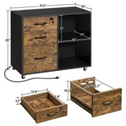 Yaheetech 3-Drawer Vintage File Cabinet With Socket And USB Charging Port Black/Rustic Brown