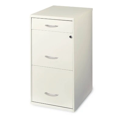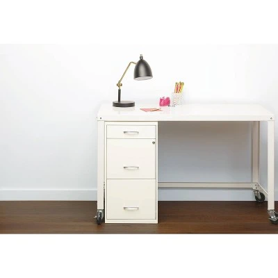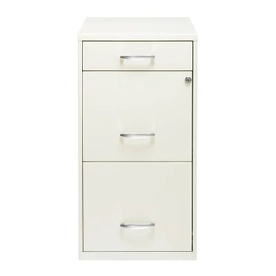 The Three Drawer Metal Vertical File Cabinet is the ideal storage solution for any small office or home office. Featuring two file drawers and an additional small storage drawer, this file cabinet is the perfect solution for your home office needs. This file cabinet features a smart, efficient design that works well in smaller spaces, and fits under most work surfaces or desks. Each drawer features high-sides to accommodate letter sized hanging files. The top pencil drawer can also be perfect storage for other office essentials. Using a patented glide suspension, the drawers have a smooth open and close slide with a three-quarter drawer extension. In addition, you can keep your files and possessions secure by using the built-in lock for both drawers. Painted steel surface is non-porous and easy to clean. Bring organization and function to your home or office with this three-drawer file cabinet.